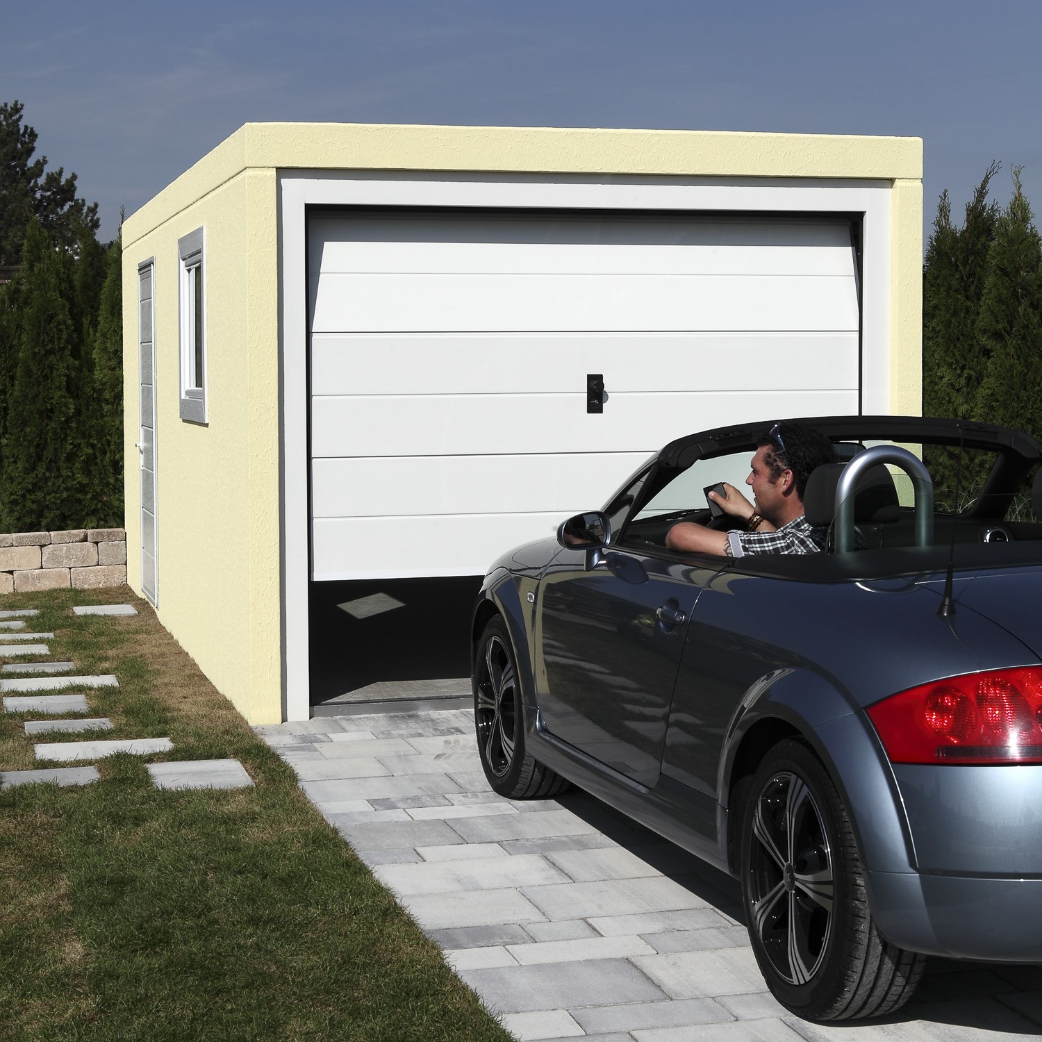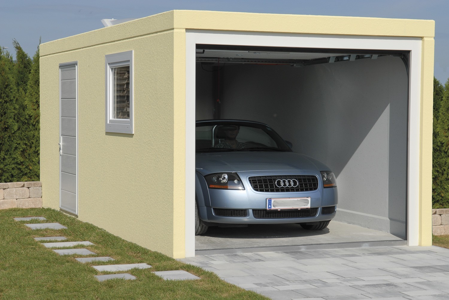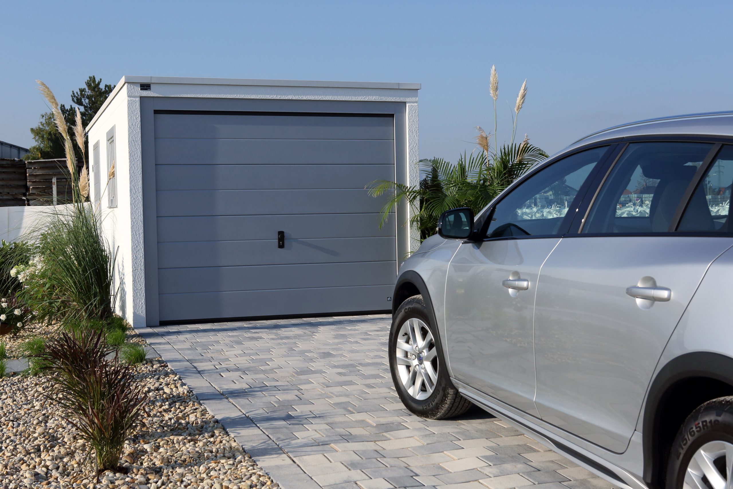 Der optimale Schutz für Ihr Auto ist individuell an Ihre Bedürfnisse anpassbar (z.B. mit Sektionaltor, mit Tür, mit Fenster, mit Elektroantrieb und mit Putz in Ihrer Wunschfarbe), in kurzer Zeit aufgestellt und alles in allem um rund 40% günstiger als eine gemauerte Garage.