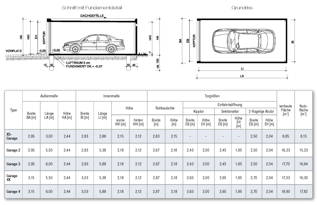 XL- und XXL-Garagen sind in zahlreichen Varianten individuell in unterschiedlichen Breiten, Längen und Höhen gestaltbar. Innenmaße, Rohbaulichte und Einfahrtsöffnung der von Ihnen gewünschten XL- bzw. XXL-Garage erfragen Sie bitte bei unserem