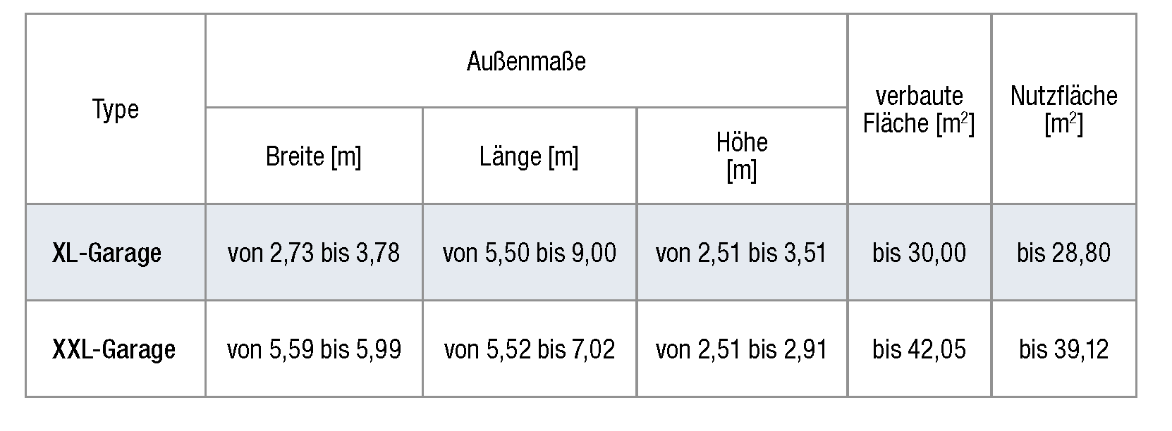 Langgaragen werden aus zwei Einzelgaragen, die hintereinander aufgestellt werden, zusammengesetzt. Einzelgaragen sind in den in den folgenden Tabellen aufgelisteten Größen verfügbar. Multiplizieren Sie also die Länge der Einzelgarage mal zwei, dann erhalten Sie die Längenabmessungen der Langgarage.